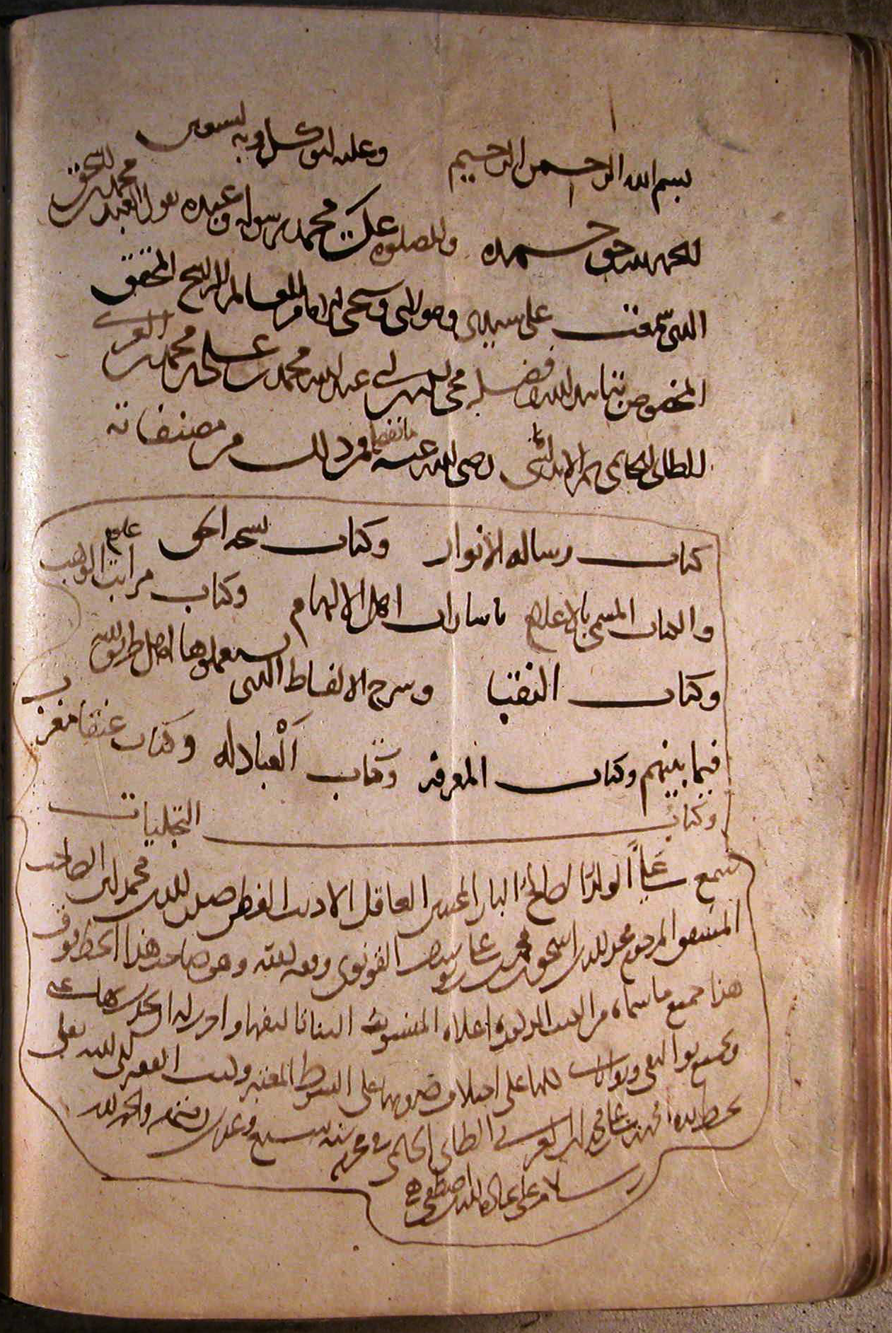 يقول العبد محمد بن إسحاق: الذي سمعت على سيدي ومولاي وشيخي الإمام العالم الراسخ المحقق المخصوص بتأييد الله وفضله محي الدين أبي عبد الله محمد بن علي بن محمد بن العربي الطائي الحاتمي الأندلسي، رضي الله عنه، ما نفصِّله؛ فمن ذلك من مصنفاته: