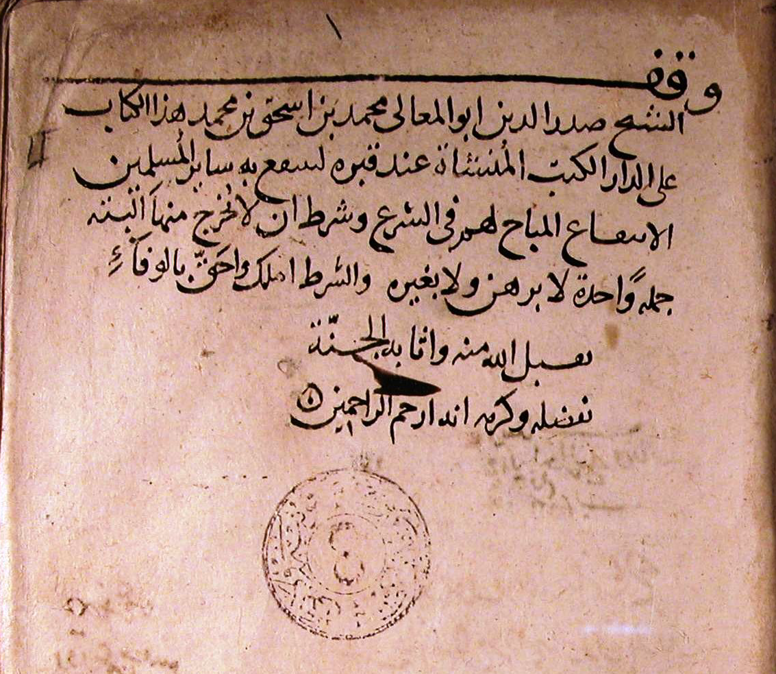[Image of the endowment on the first page of the Yusuf Agha 7838 manuscript]Image of the endowment on the first page of Yusuf Agha 7838 manuscript, according to which this collection was preserved in the private library of al-Qunawi in his Mosque in Konya.